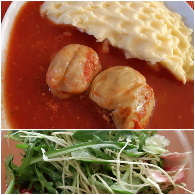 Danes polnjene paprike iz zaloge, pire krompir, solata
