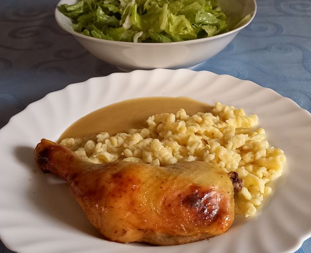 Kremna zelenjavna juhica; pečeno pišč. bedro, špecli, omaka; zelena solata