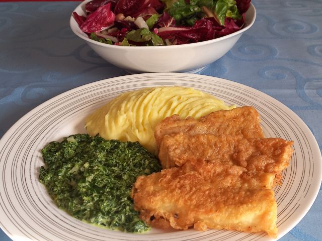 Paniran file osliča, pire krompir, špinača; radič s krompirjem in fižolom