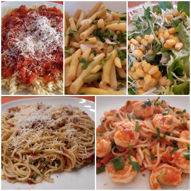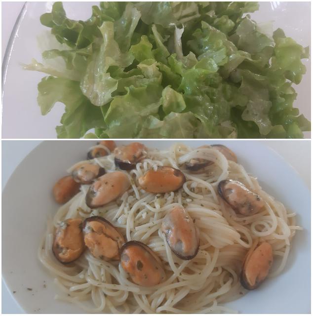 Sin svedrčki s paradižnikovo omako, jaz pečene riževe rezance z gamberi začinjenimi s kitajskimi začimbami, mož špagete s čili- česnovo omako, zame sveža solata s koruzo, domači stročji fižol v solati