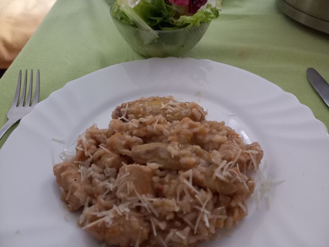 Danes goveja juha z rezanci, musaka od včeraj, solata. Na kosilu po dolgemu času tudi hčerka