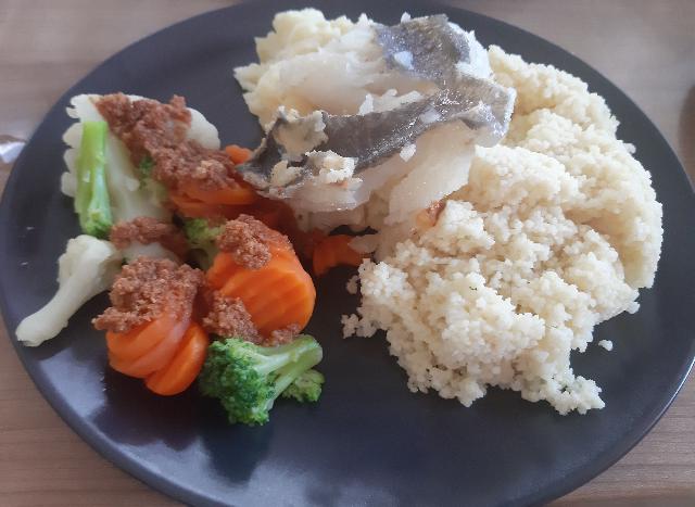 Dušen kuskus s šalotko, pire z limeto, zelenjava z droptinicami in neposrečeno pečen kovač(bil je zmrznjen s takim slojem leda, da, kljub sušenju s papirnatmi brsačami nisem spravila dovolj vode iz njega, zato se ni naredila lepa skorica):
