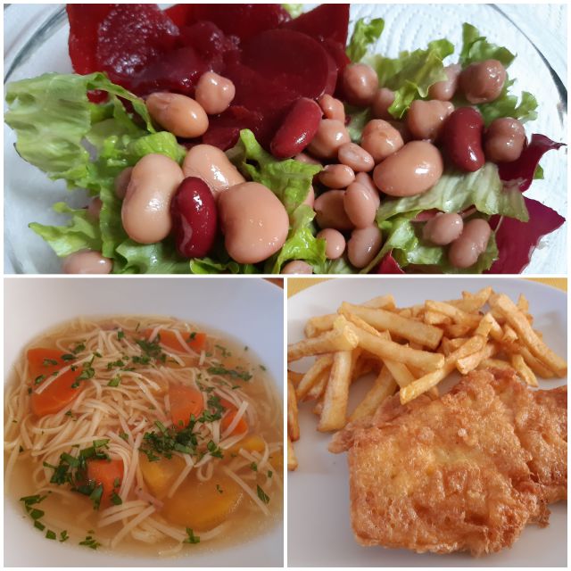 Danes goveja juha z rezanci, pariški zrezek, pomfri, solata z različnimi stročnicami