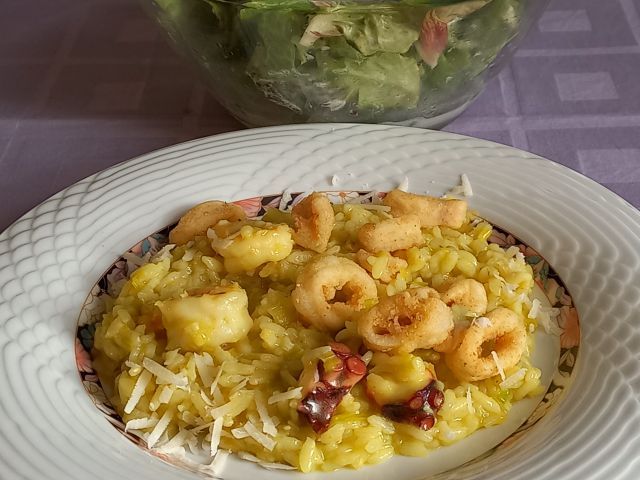 taca) z domačimi rezanci; rižoto z morskimi sadeži in friganimi kalamari; večbarvni radič s krompirjem