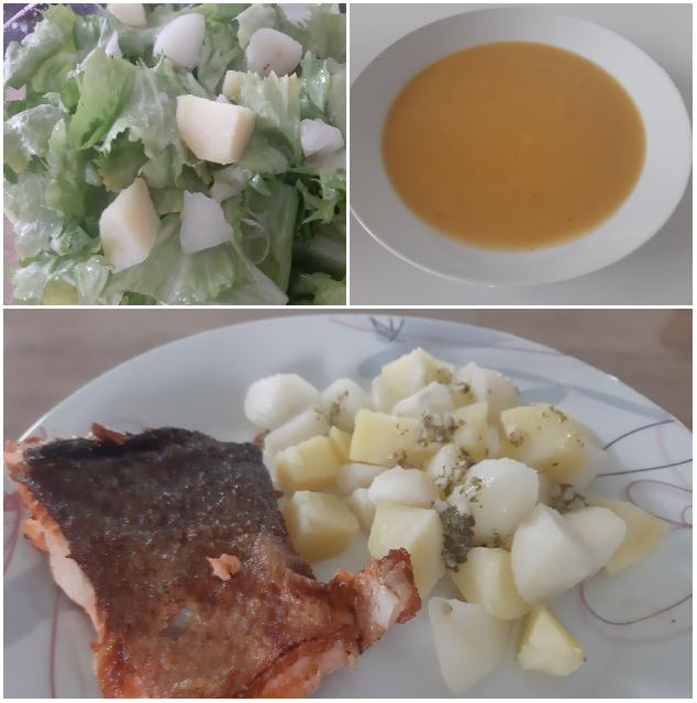 Kremna zelenjavna juha, losos, krompir z zelišči, endivja: