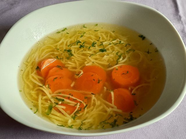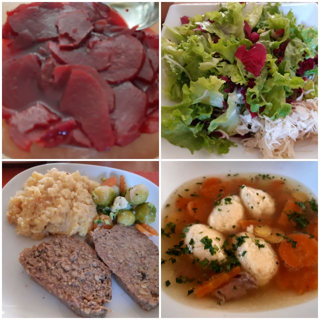 Danes pohod na svežemu zraku in močnemu vetru ... goveja juha z zdrobovimi cmoki, mesna pečenka od včeraj, zelenjava od včeraj, pražen krompir, solata, rdeča pesa