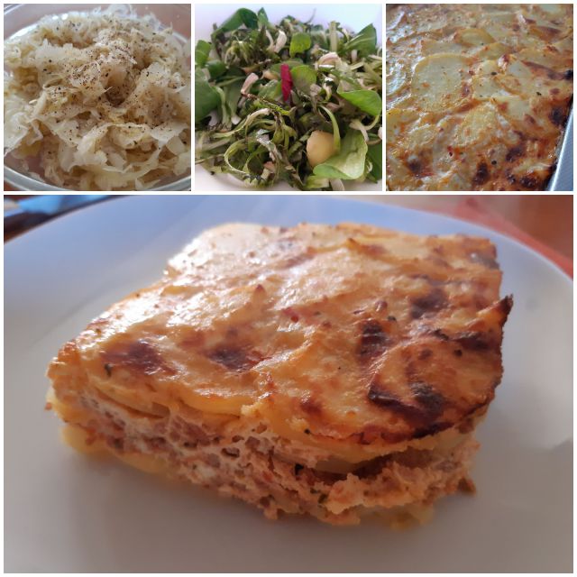 Danes musaka, kislo zelje v solati, regrat in motovilec. V planu so bili še krofi, ampak danes ni zneslo. Bodo konec tedna.