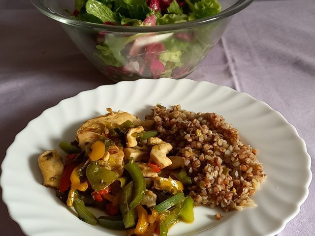 Piščančja juhica (od včeraj), tokrat z rezanci; ajdova kaša, 3-barvna paprika s porom in piščančjimi trakci - vse v voku; zelena solata in radič
