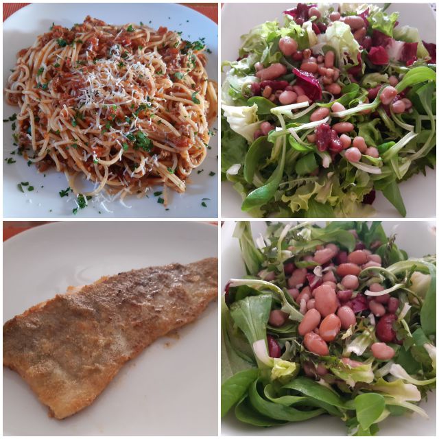 Včeraj za moja dva testenine bolognese in mešana solata z različnimi žiti. Zame kasneje solata in file soške postrvi.