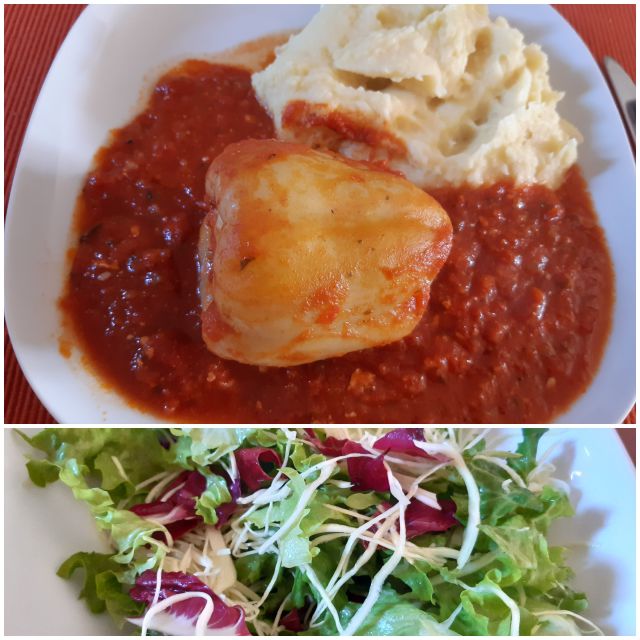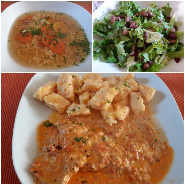 Danes goveja juha z ribano kašo, zrezki v moji posebni omaki, bučni njoki s skuto, solata