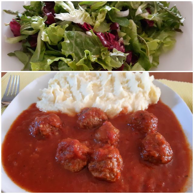 Špageti a`la bologneze; zelje, krompir in fižol na solato