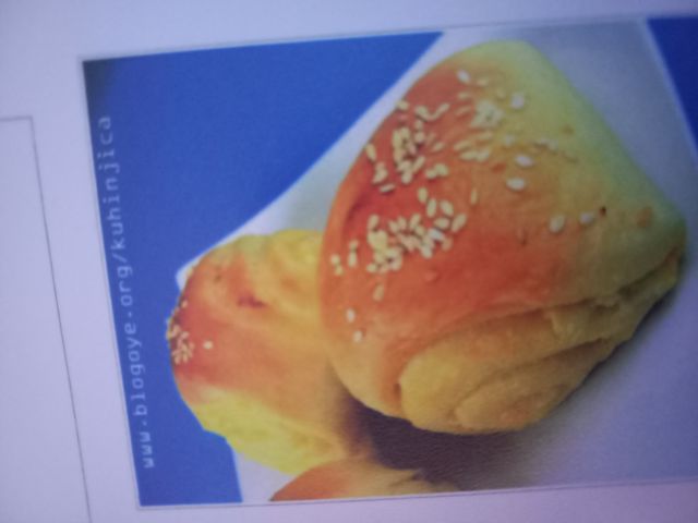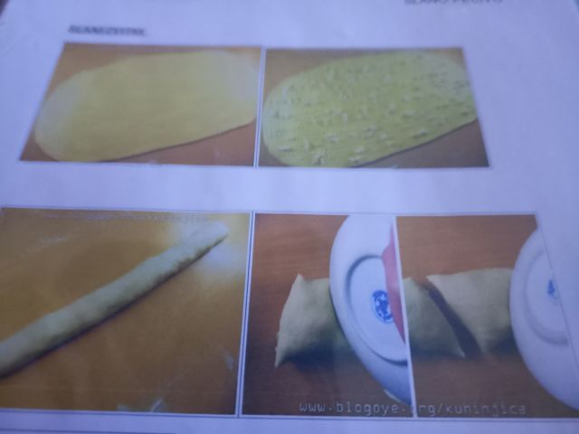 Ker naslov bloga ne morem odpreti, vam recept pripenjam tukaj. 50 dag bele moke, 2 dl mleka, 1 dl vode, 1 dl olja, 1 žlička soli 1/2 kocke kvasa, 1 žlička sladkorja, 1 žlička moke _________________ 10 dag margarine Dobro jutro ali Rama, 2 rumenjaka, 1 žlička soli, 10 dag skute V toplem mleku raztopi kvas, žličko sladkorja in žličko moke. Postavi na toplo, da kvas vzhaja. Iz sestavin naredi testo, pokrij ga s prtičkom ter pusti počivat 45 minut. Kupček testa razdeli na dva dela. En del testa razvaljaj, premaži s polovico nadeva, posuj s skuto ter zarolaj. S krožnikom reži trikotnike, ki jih posloži na pekač. Trikotničke pusti vzhajati približno 20 minut, potem jih premaži z zmešanim beljakom ter posuj s sezamom. Pekač daj v vročo pečico ter peči približno 20 minut na 180 stopinj.