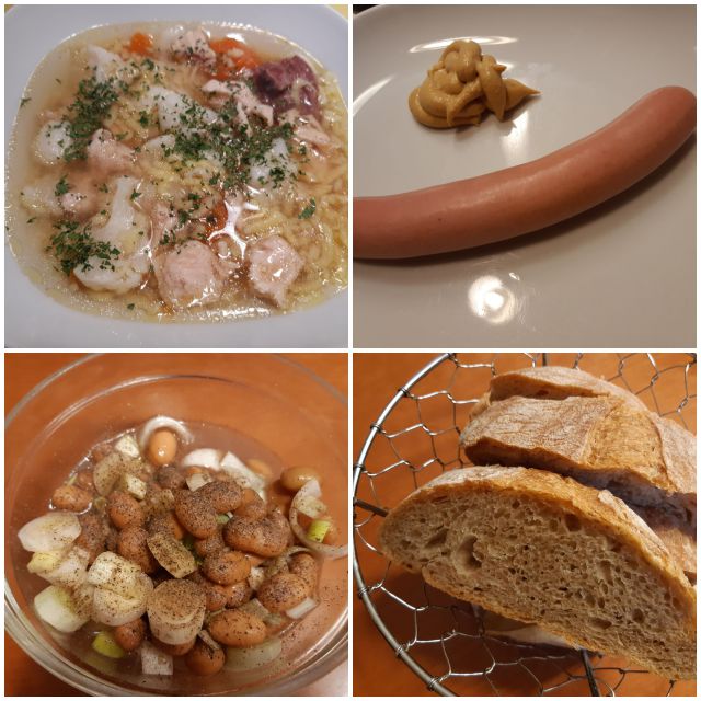 Danes ni bilo časa in kosilo na hitro- sin Mc Donalds, mož hrenovko, fižol v solati, jaz kokošjo juho iz zaloge z ribano kašo in cvetačo.