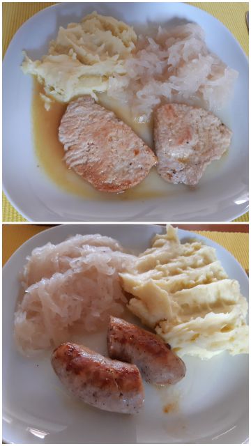 Včeraj kisla repa, pire krompir, puranji zrezki, pečenica