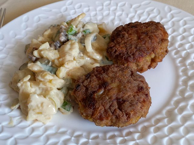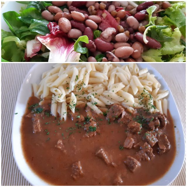 Predvčerajšnjim ostanek golaža s testeninami, mešana solata s stročnicami