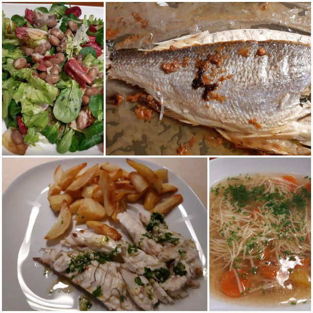 Danes goveja juha iz zaloge, pečena orada ( haha, sem slikala, ko sem glavo odrezala), pečen krompir, mešana solata.