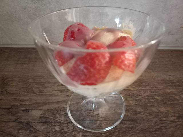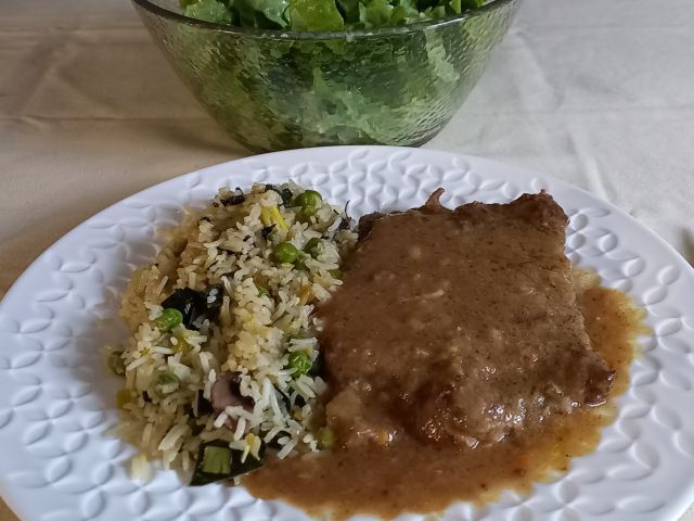 Gov.zrezki v naravni omaki, basmati riž na poru in grahu; zelena solata; sladoled in jagode