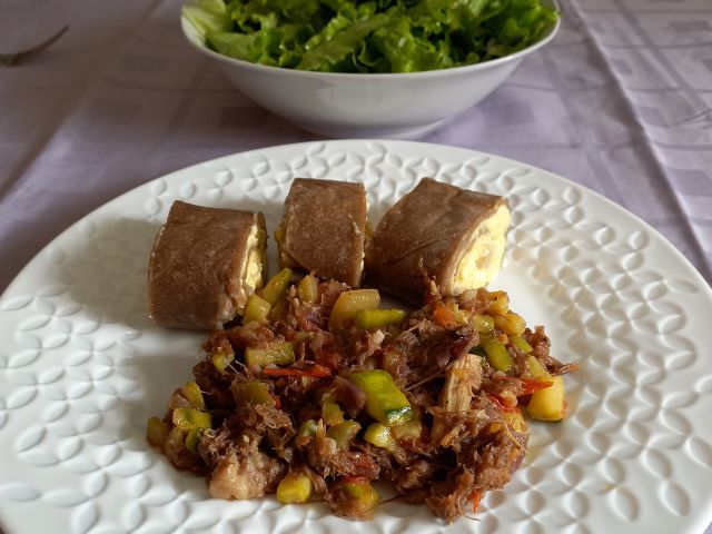 Ajdovi štruklji, reciklaža govedine z dodatkom bučke; zelena solata