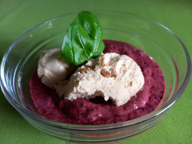 Kostna juhica z rezanci; pečeno puranje bedro, mlinci; zelena solata; borovničev in sladoled