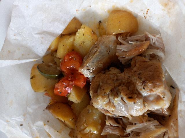 Piščančje bedro brez kosti, krompir, paprika in bučke v škartocu.