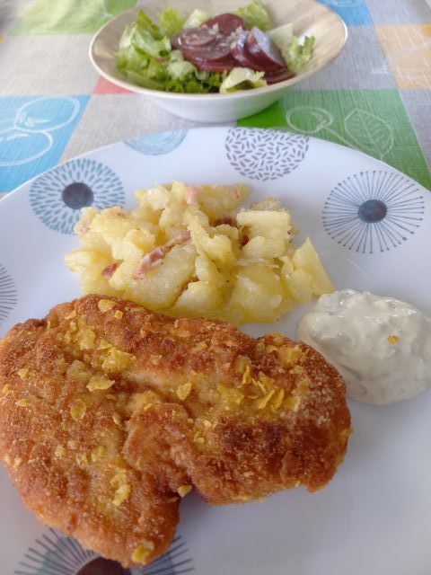 Kremna zelenjavna juhica; pražen krompir, panirani piščančji zrezki, omakica (majoneza, smetana, kumarice); zelena solata, rdeča pesa