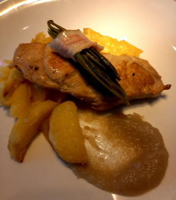 Telecji hrbet v timijanovi omaki, pire krompur z jurčki, stroki graha na maslu, solata.