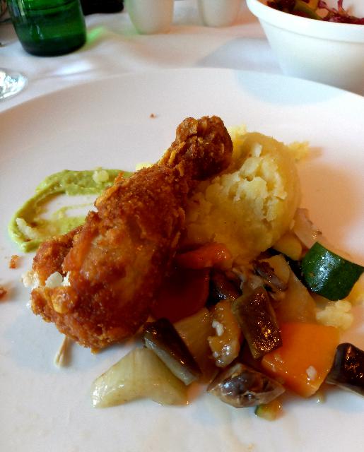 Pohano pisčančje bedro v ovsrnih kosmičih, tenstan krompir, popecena zelenjava, avokadova pomaka in solata.