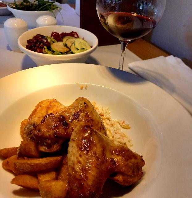 Goveja juha z zdrobovimi zlicniki, pecene perutnicke z žar omako, pecen krompir, korencek in zelje z majoneznim prelivom, solata in deci vincka.