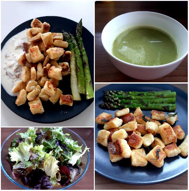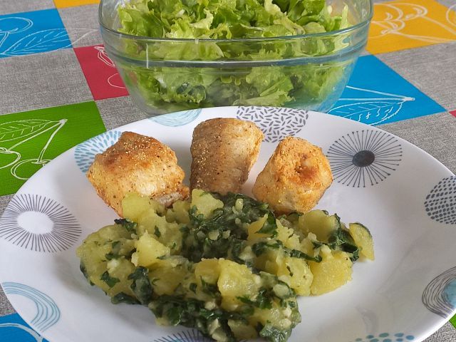 Zelenjavna juhica z ribano kašo; krompir z blitvo, pečen oslič; zelena solata