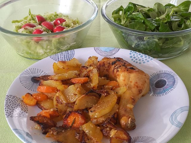 Pečeno piščančje bedro, krompir s korenčkom; zeljnata in motovilec solata