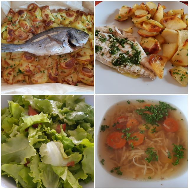 Včeraj goveja juha z rezanci, pečena orada, pečen krompir, berivka s paradižnikom