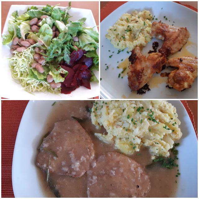Danes svinjski kare z žajbljem, pražen krompir, perutničke, zeljna solata z ledenko, rdečo peso in fižolom