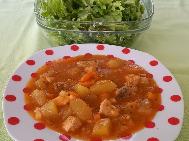 Krompirjev golaž s piščančjim kosi, zelena solata