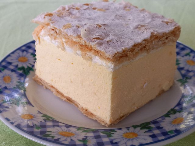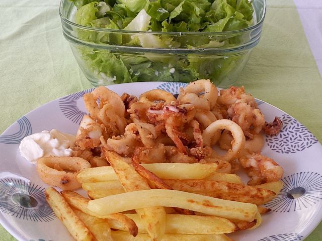 Frigani lignji, pomfri; zelena solata; kremšnita; pivo