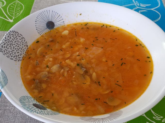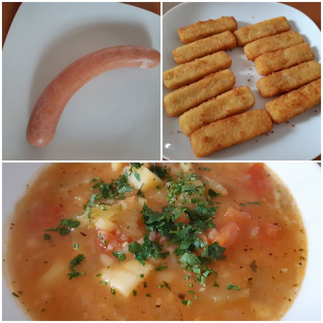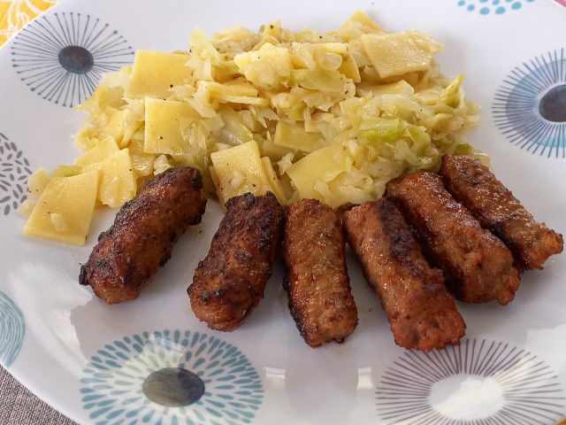 Porovo-šampinjonova juhica; krpice z zeljem, čevapčiči