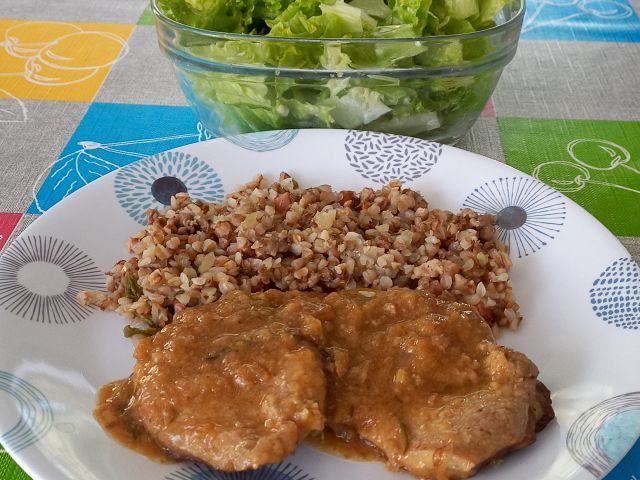 Sv.zrezki v omaki, ajdova kaša na slanini; zelena solata