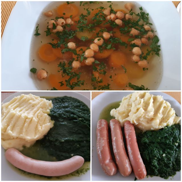 Včeraj goveja juha - z zlatimi kroglicami/rezanci, pire krompir, špinača, hrenovke