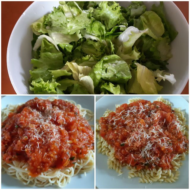 Danes musaka, zelena solata, rdeča pesa, jagodno- rabarbarina pita