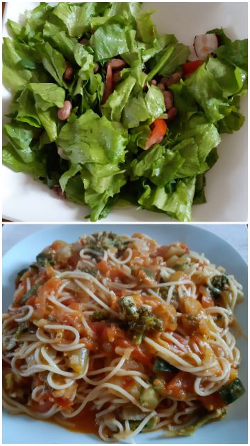 Danes testenine z zelenjavno omako, solata z rukolo, s fižolom in paradižnikom