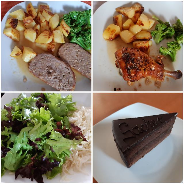 Danes mesna pečenka, piščanje bedro, pečen krompir, domač brokoli, domača solata, sacher torta
