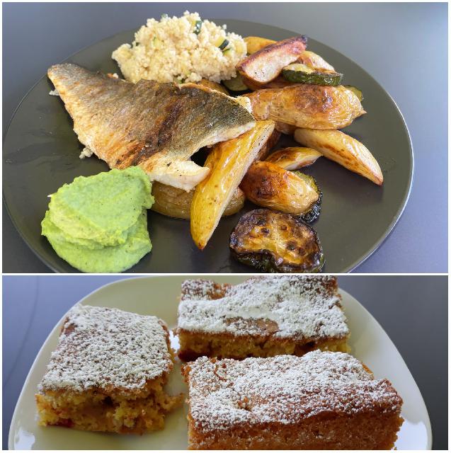 File orade, kuskus z bučkami, pečen krompir in bučke, grahov pire z meto, zelena solata, pecivo z ribeza, češenj in breskev, domači ledeni čaj: