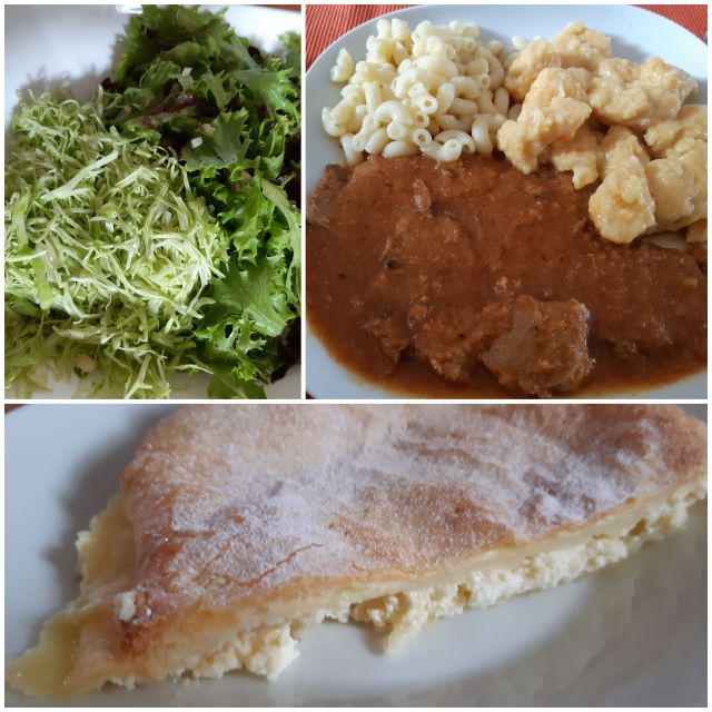 Danes telečji zrezki v omaki, bučni cmoki, makarončki, solata, skutni zavitek in jagodno- rabarbarina pita