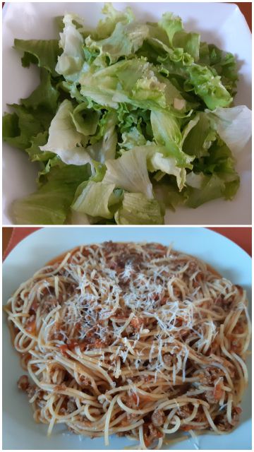 Včeraj bolognese omaka s špageti, zelena solata z vrta