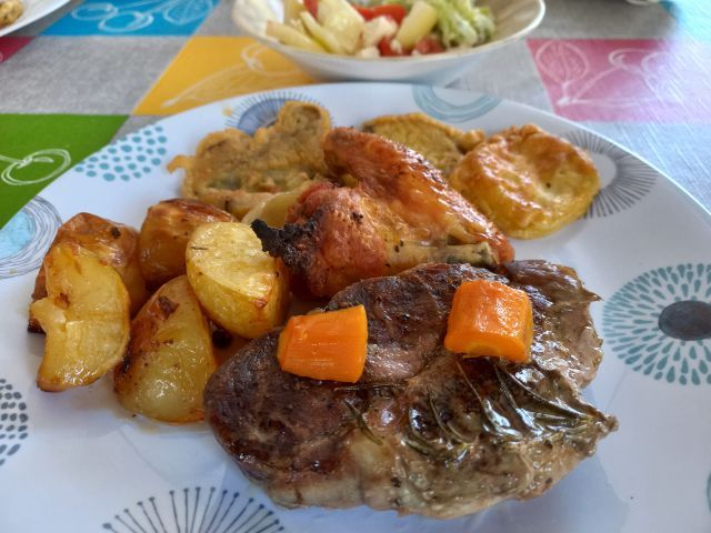 Juhica; pečene perutničke, vratovina, krompir; panirane bučke in malancani; zeljnata, grška solata, kumarice z jogurtom in česnom; zapečene palačinke s skuto in kokosom