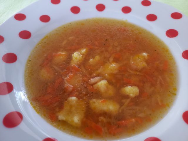 Korenčkova juhica z žličniki; pomfri (pečen v pečici), paniran piščančji file, panirane bučke, jogurtova omaka; zelena solata; sirni zavitek