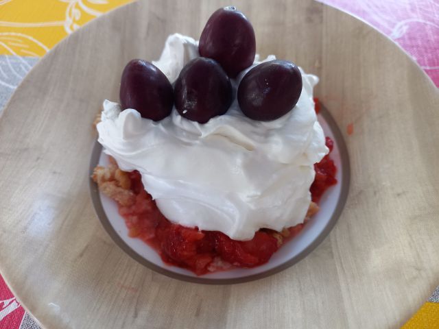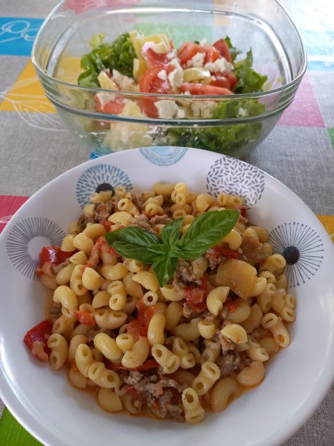Makarončki z omako; mešana solata; jagode, smetana, češnje