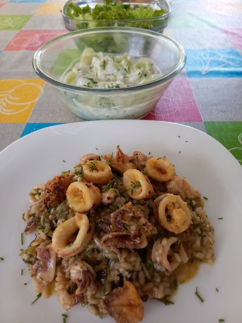 Rižoto (por in lignje), še malček friganih ligenj; kumarična solata z grškim jogurtom, zelena solata