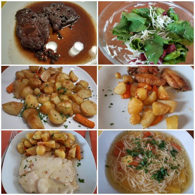 Danes goveja juha z rezanci/ zlatimi kroglicami, pečene perutke, piščančji file s sirom, sv.zrezek v refoškovi omaki z zelenim poprom, domač krompir z mladim korenjem, solata