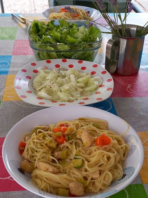 Špageti v piščančje-zelenjavni omaki; kumarična in zelena solata
