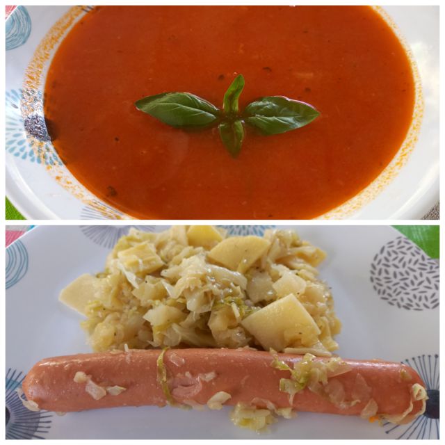 Paradižnikova juhica z rižem; krpice z zeljem, hrenovka